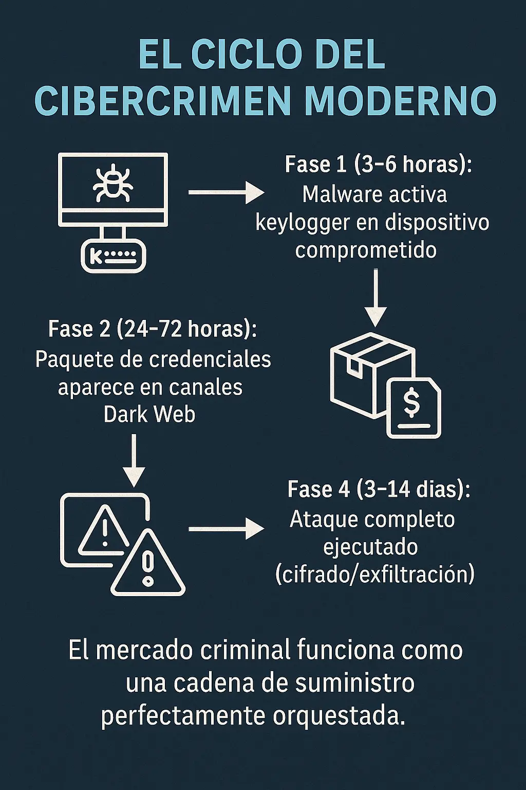 - Fase 2 (24-72 horas): Paquete de credenciales aparece en canales Dark Web