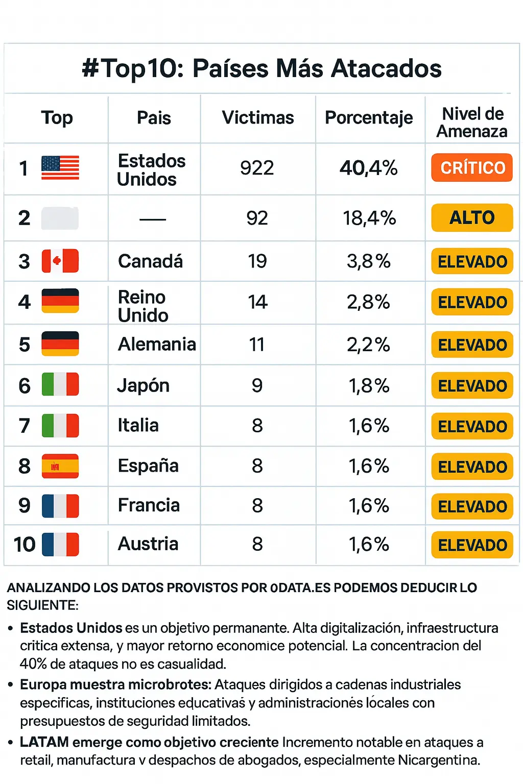 - Estados Unidos es un objetivo permanente: Alta digitalización, infraestructura crítica extensa, y mayor retorno económico potencial. La concentración del 40% de ataques no es casualidad.